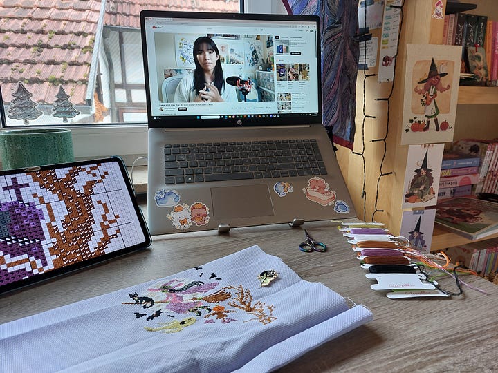 I also finally had some time to continue on my Halloween Stich-A-Long cross stitching project by caterpillarcrossstitch. It’s so relaxing to just watch a movie or an anime - lately I’m also really into watching artist’s vlogs of conventions - and cross stitch pumkins or scary trees, it’s one of my favorite creative hobbies at the moment.